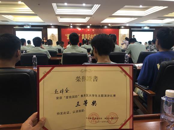 9月12日,由中共集美区委宣传部、集美区人民武装部主办的“爱我国防”集美区大学生演讲比赛顺利举行,我校积极组织师生参加,值得一提的是,18计算机网络1班的赵骅全同学喜获三等奖。