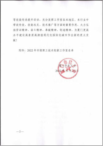 根据《厦门市总工会关于加强“职工技术创新工作室”建设的通知》(厦工〔2022〕9号)文件要求,我校工会组织教职工发挥专业优势,积极申报。经考核验收,以邹忠爱、赖源发两位老师命名的工作室被确定为2022 年市级职工技术创新工作室。至此,我校已有三个以教职工命名的市级职工技术创新工作室。