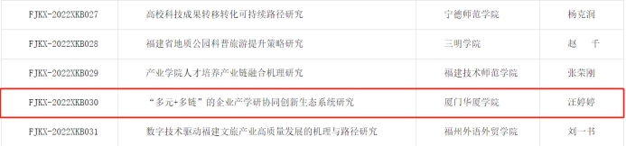 该项目聚焦福建省推动数字经济、绿色经济、文旅经济等省战略性新兴产业高质量发展的需要,运用协同创新理论、汇集政行企校智慧和资源,研究适用于产学研协同创新的生态系统建设模式,是落实学校“地方性、应用型、开放式”的办学定位的又一重要举措。汪婷婷教授领衔的研究团队深耕产教融合研究和实践领域多年,经验丰富,相关研究成果荣获福建省第十届高等教育教学成果二等奖,实践案例入选《中国高等教育博览会“校企合作双百计划”典型案例》和《福建省本科高校教育教学改革研究典型案例汇编》。