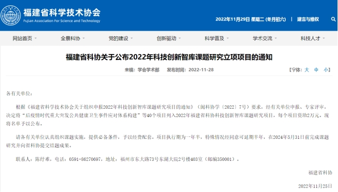 福建省科协科技创新智库课题研究项目旨在深入实施创新驱动发展战略,组织动员广大科技工作者围绕我省经济社会发展重大问题和科协组织创新发展问题开展创新战略研究,提出前瞻性、建设性意见建议,为党委政府科学决策提供智力支撑,不断开创新发展阶段新福建建设新局面。根据《福建省科学技术协会关于组织申报2022年科技创新智库课题研究项目的通知》(闽科协学〔2022〕7号)要求,经有关单位申报、专家评审,本次共有40个项目入选。