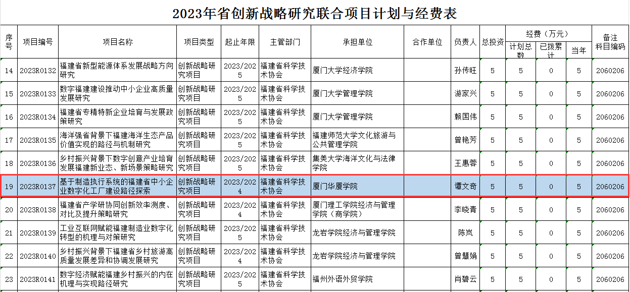 近日,福建省科学技术厅和福建省科学技术协会联合公布了2023年福建省创新战略研究联合项目名单,我校信息与智能机电学院谭文奇老师申报的《基于制造执行系统的福建省中小企业数字化工厂建设路径探索》(项目编号:2023R0137)获批立项。该项目是我校获批的首个福建省创新战略研究联合项目。