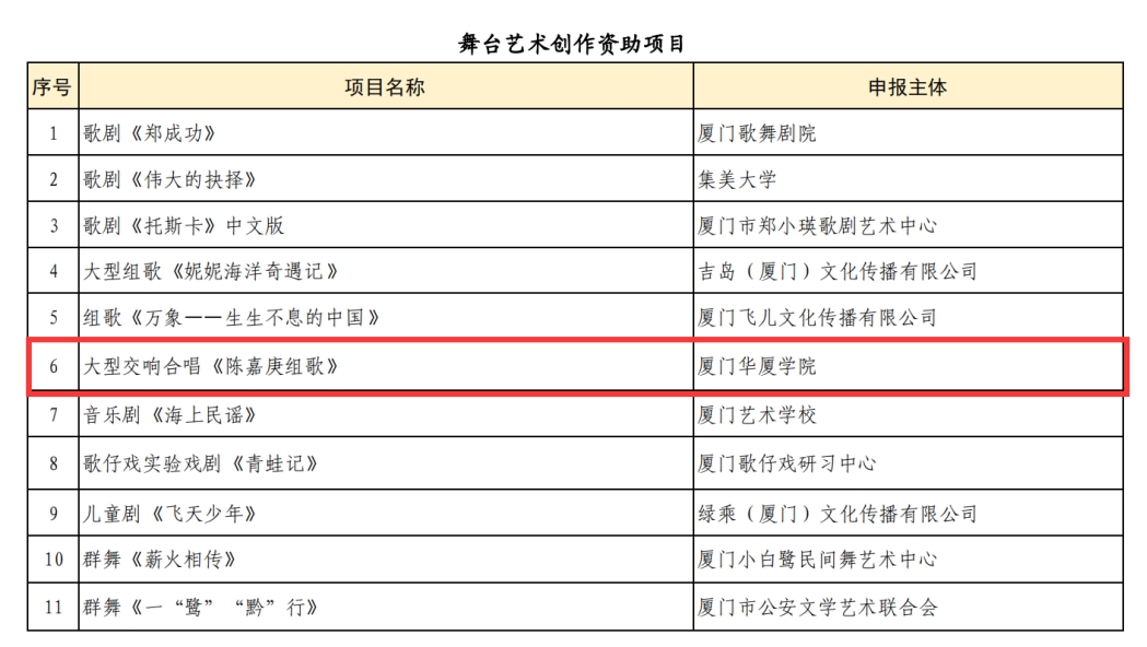 2024年度厦门市文艺发展专项资金项目经过受理申报、资格审查、国内专家初审、复审、终审、网上公示等程序,经厦门市政府部门同意,公布立项100项,其中舞台艺术创作项目仅有两所高校立项,我校为其中一所。