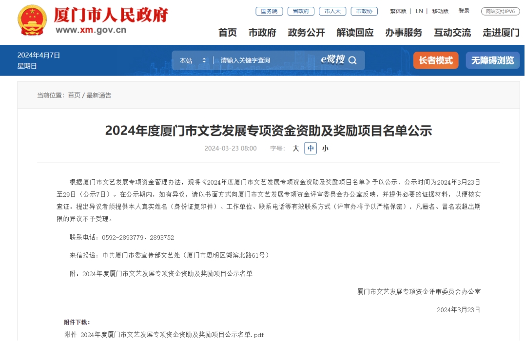 2021年厦门市委宣传部联合市文旅局、市文联、市财政局设立“厦门市文艺发展专项资金”,整合自2016年以来推出的系列文艺扶持政策,全新制定《厦门市文艺发展专项资金管理办法(试行)》。厦门市文艺发展专项资金旨在繁荣我市文艺创作、打造精品力作、培养文艺人才 ,加强文化交流,推动我市文艺事业繁荣发展。专项资金每年面向社会受理厦门市或为厦门市创作生产的文化艺术项目资助或奖励申报。