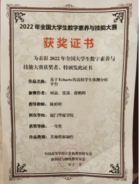 在学习上,何晶勤奋刻苦,除了课堂学习,积极通过参加学科竞赛、项目研发,将理论知识转化为实践成果。参与“全国大学生数字素养与技能大赛”期间,学生带领团队通过大数据技术分析历年体测数据中的众多体测项目,设计基于ECharts的高校学生体测分析平台,获得国家级一等奖。此外,在校期间学生基于研究成果发表《基于Echarts的英雄联盟(LPL)数据可视化分析》《基于改进U-Net的胃肠道MRI图像分割》论文2篇。