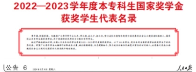 2024年五四青年节当天,《人民日报》刊登了100位2022—2023年度本专科生国家奖学金获奖学生代表名录,我校2020级本科生何晶入选。此次为我校学子第二次入选《人民日报》“国家奖学金代表名录”百名榜(我校2016级本科生包晗琳于2019年首次入选)。