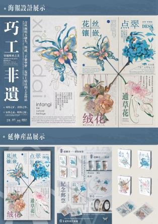 2、魏东翰、林志鹏、蔡琳同学作品《千年非遗鬓上奇缘》,本作品以中国传统文化非遗传承———花丝镶嵌、点翠、绒花、通草花为源。背景以纯白色为底,四张海报以四种不同的非遗为主体,蕴含了浓厚的古韵和传统文化非遗的风采。文字排版以简约为主,更具有现代感,把非遗的时代感与现代海报的时尚感融合在一起。每张海报也在排版上对4种非遗进行了介绍,这也是对中国非遗的一种宣传。在这个快节奏的时代,我们常常忽略了我们身后那些沉甸甸的文化底蕴。中国非物质文化遗产,就是这些文化瑰宝中最闪耀的一颗星,代表着中华民族几千年来的文化积淀,是中华民族的骄傲和自豪。