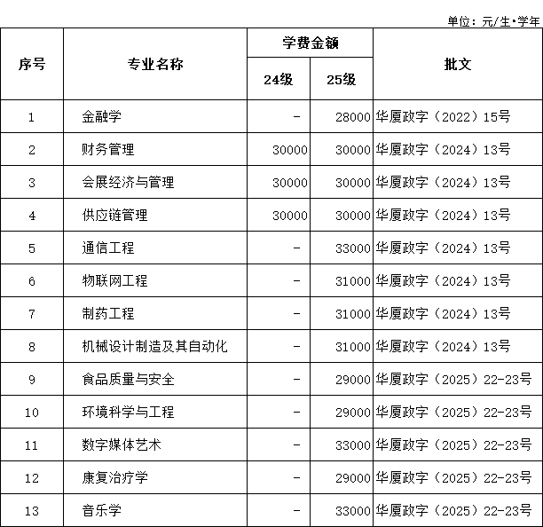 四、本科辅修专业费用:辅修专业学生按照当学期所修课程学分缴纳学费,学分收费标准按200元/学分收取(闽价费〔2005〕435号; 华厦政字〔2016〕123号、华厦政字〔2016〕124号)。