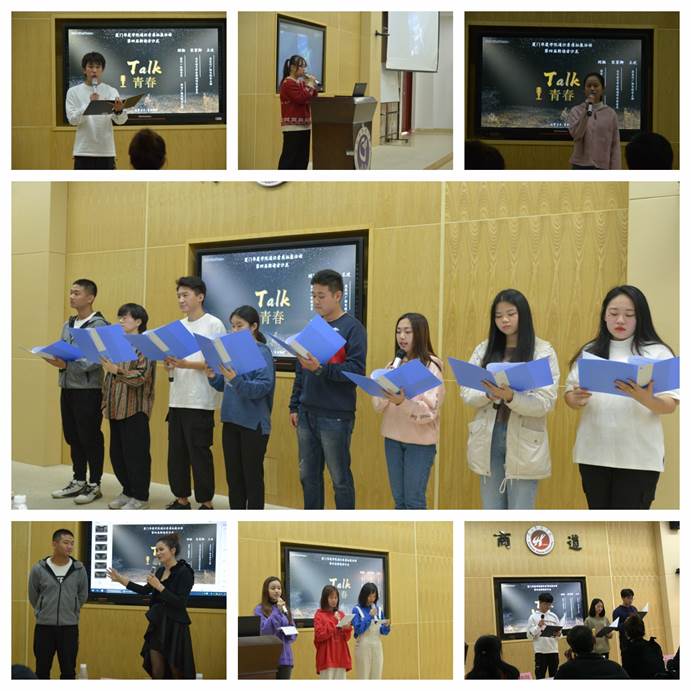 活动现场,同学们风采展示,有带来精彩的朗诵表演《小遇青春》,解读和赞颂了美好青春;《闪耀吧青春的火光》展示了壮丽青春的激荡和家国情怀;《走向远方》告诉学子们,在成长中会经历很多的挫折磨难,要“把眼泪像珍珠一样收藏”;《无憾青春》宣告了“谁虚度了年华,青春就将褪色”,奋斗的青春最美;《青春的赞歌》《花儿与少年》《青春·不平凡》等作品都情真意切的表达出对青春的思考、迷茫和展望等思想感情,每一个同学们的朗读都把大家带进一个个特定的意境情境中,体会文字的优美和丰富的情感世界。口语艺术三班同学的集体节目《放飞青春》抒发出所有朗读者的心声,在诗韵美文的字里行间放飞青春,在人生春秋的大道上奋发有为。